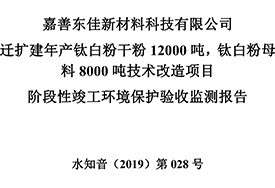 公?? 示??? 根據《國務院關于修改〈建設項目竣工環(huán)境保護管理條例〉的決定》(國務院令第682號),以及環(huán)保部《關于發(fā)布的公告》(國環(huán)規(guī)環(huán)評[2017]4號),現(xiàn)將嘉善東佳新材料科技有限公司遷擴建年產鈦白粉干粉12000噸,鈦白粉母料8000噸技術改造項目階段性竣工環(huán)境保護